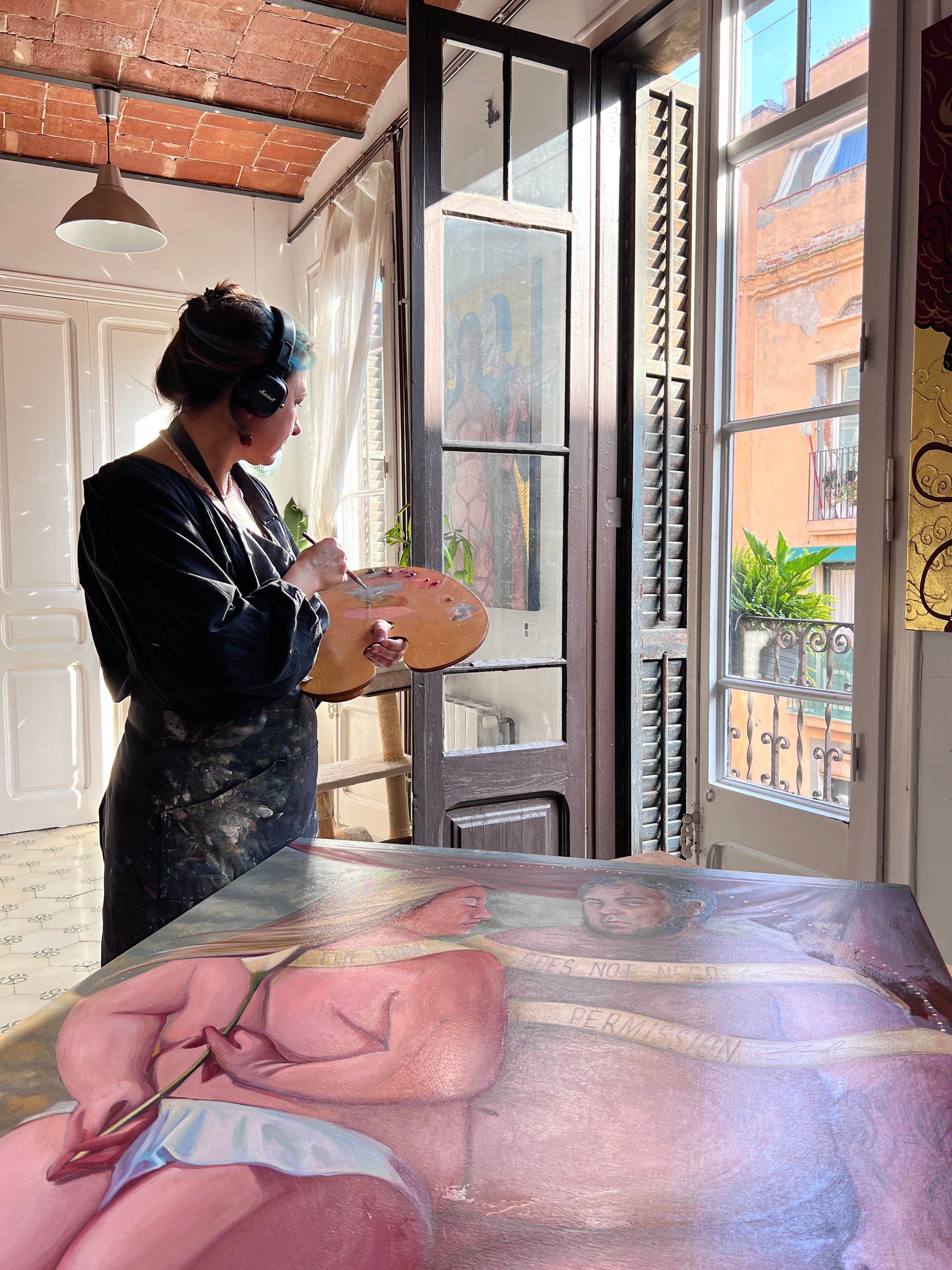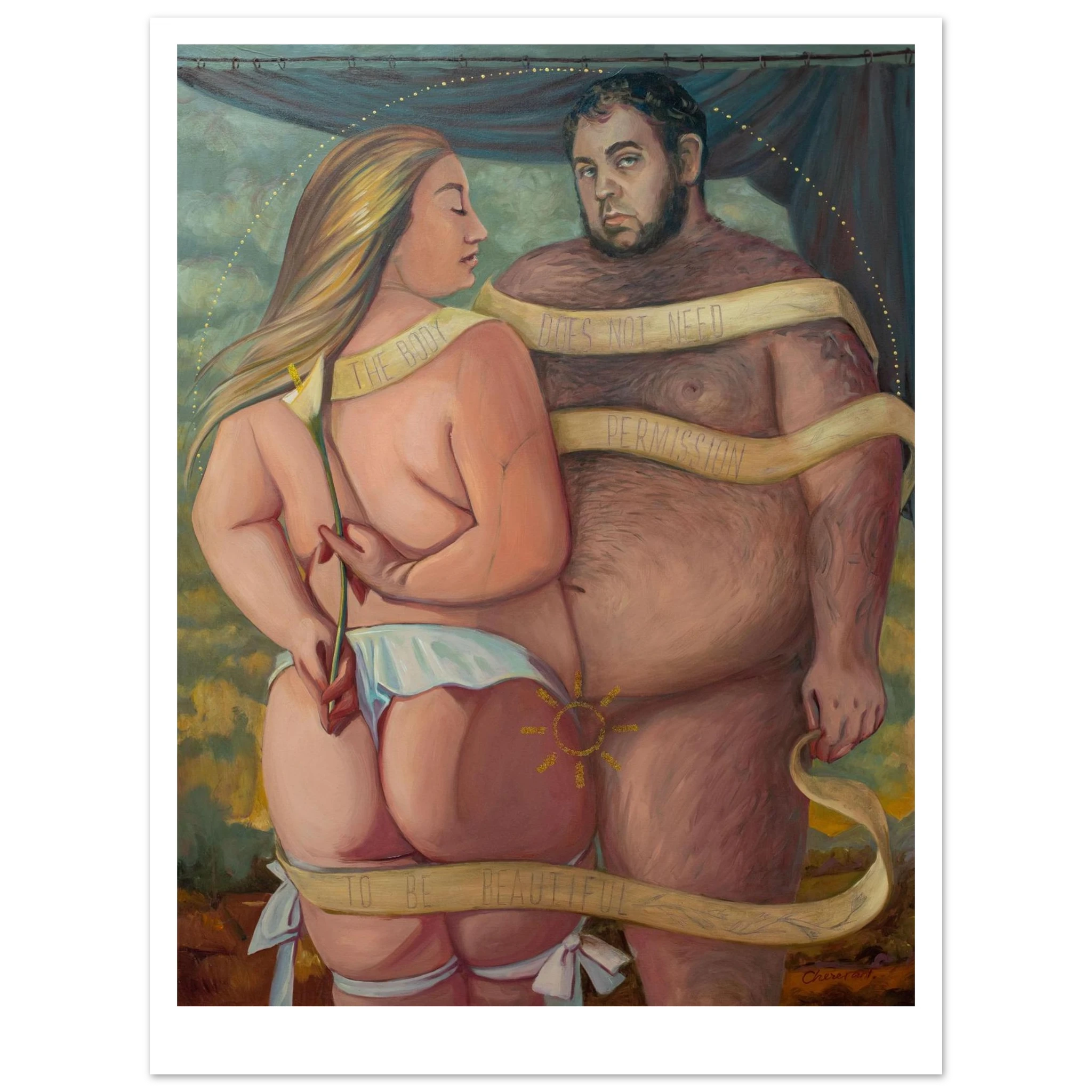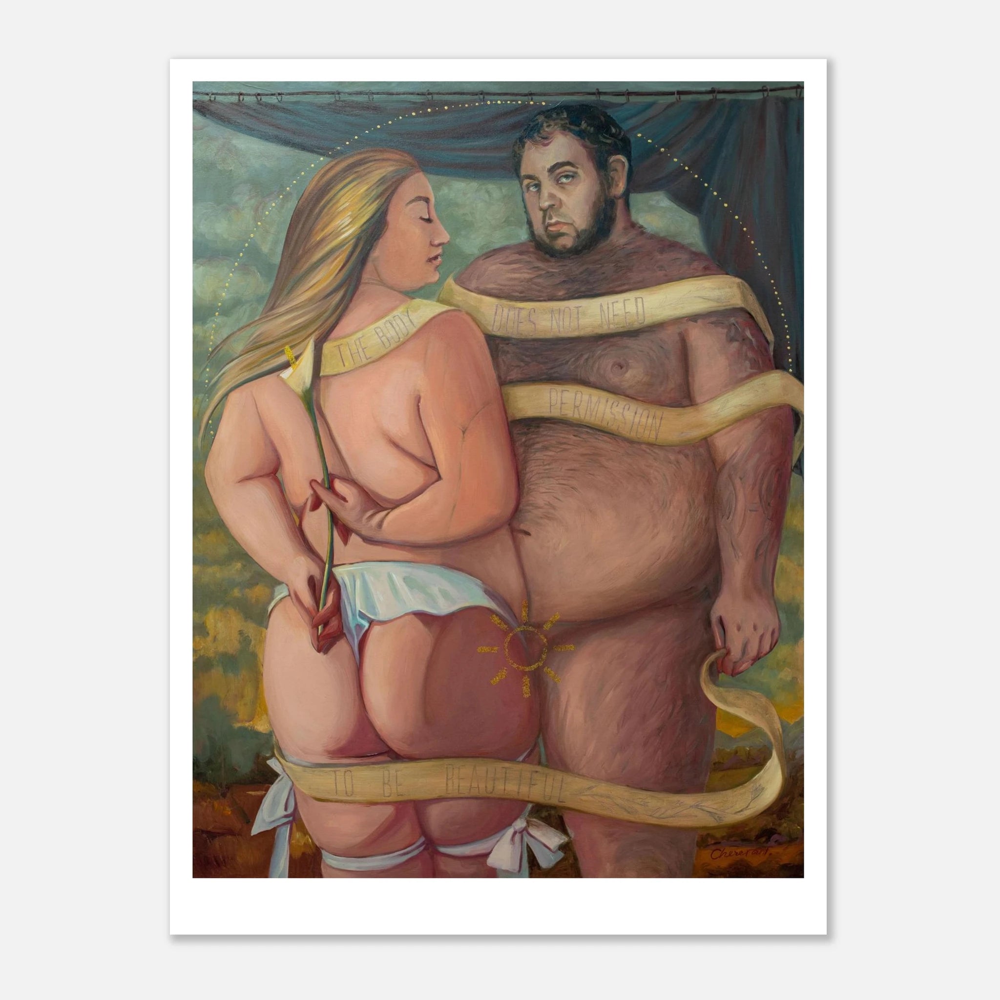 This artwork portrays a man and a woman standing nude, proud and open — accepting their bodies as they are. A soft ribbon gently wraps around them, bearing the message: “The body does not need permission to be beautiful.”