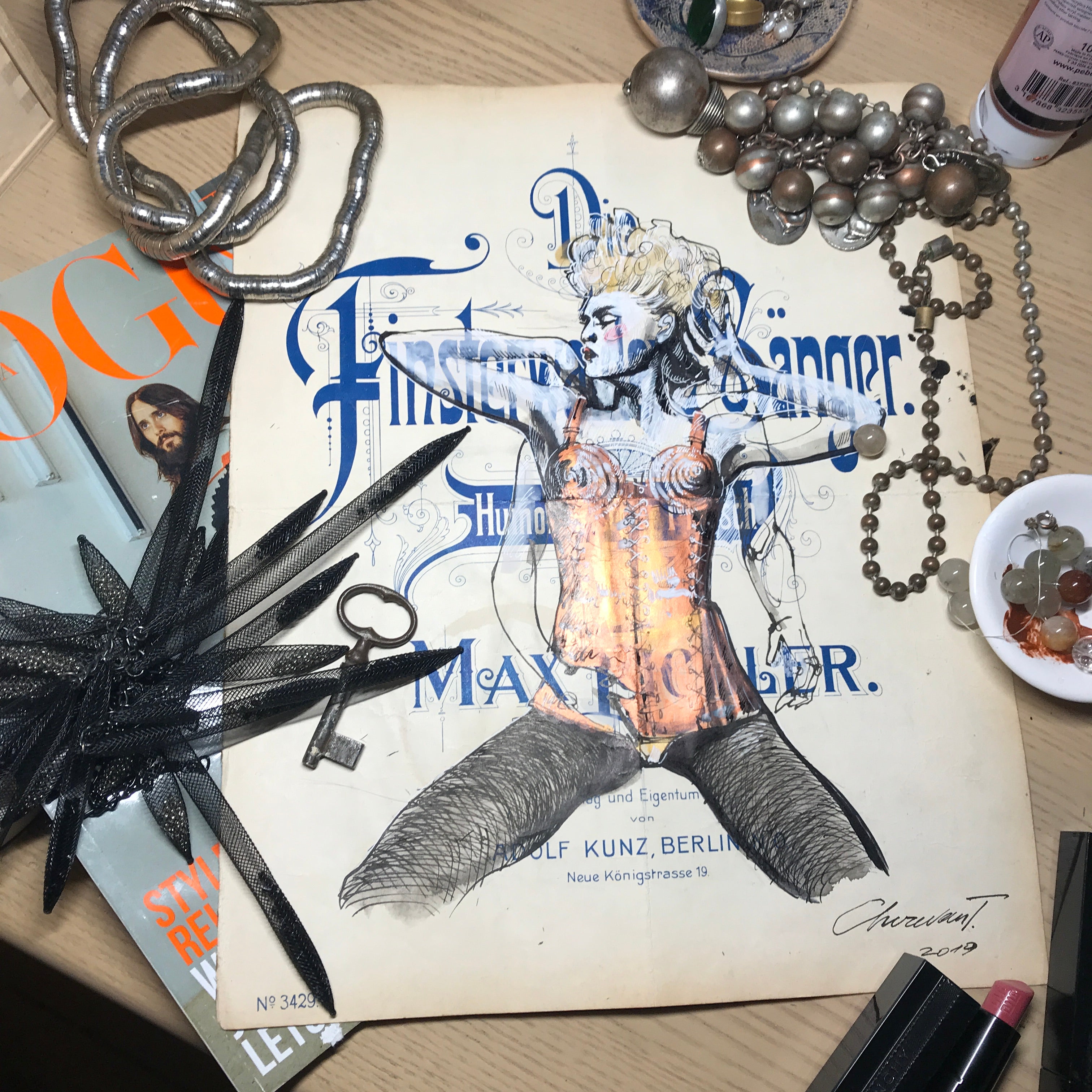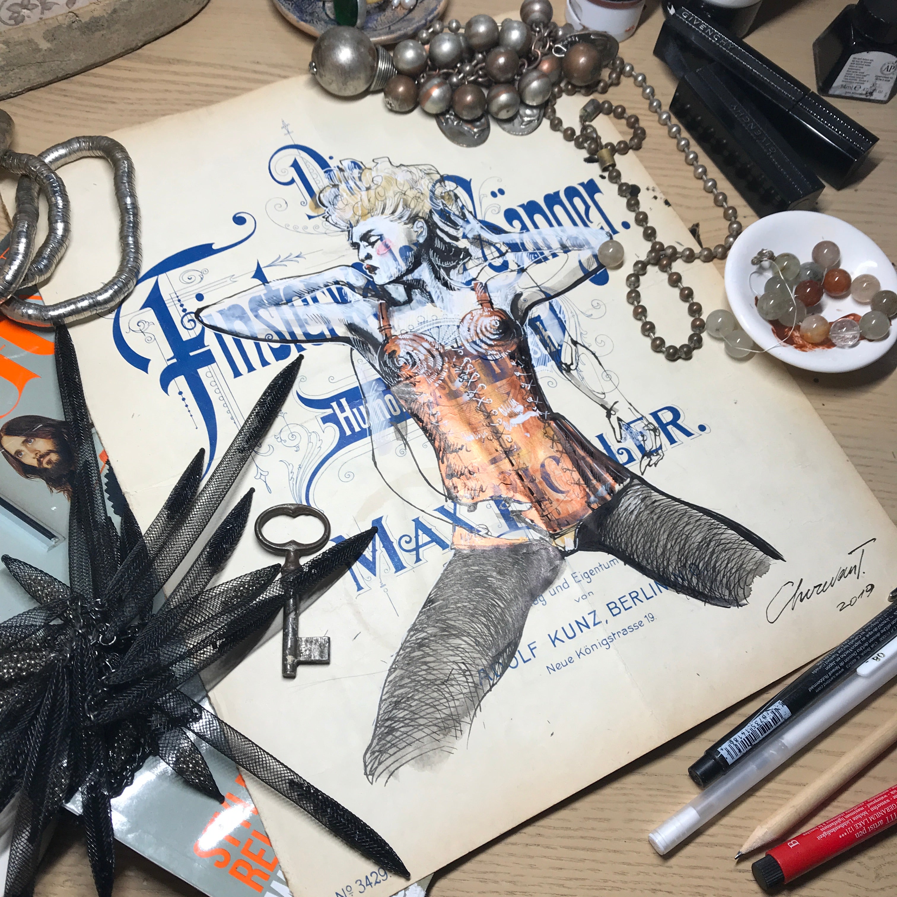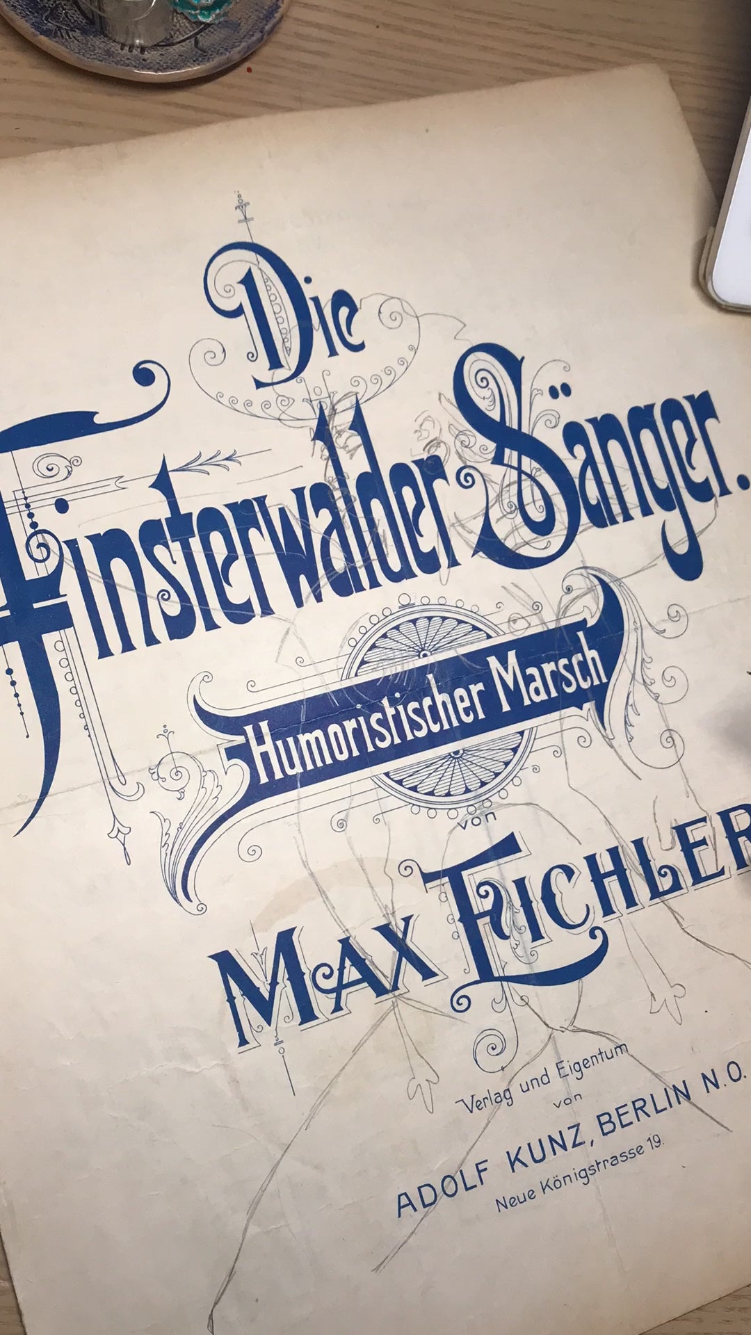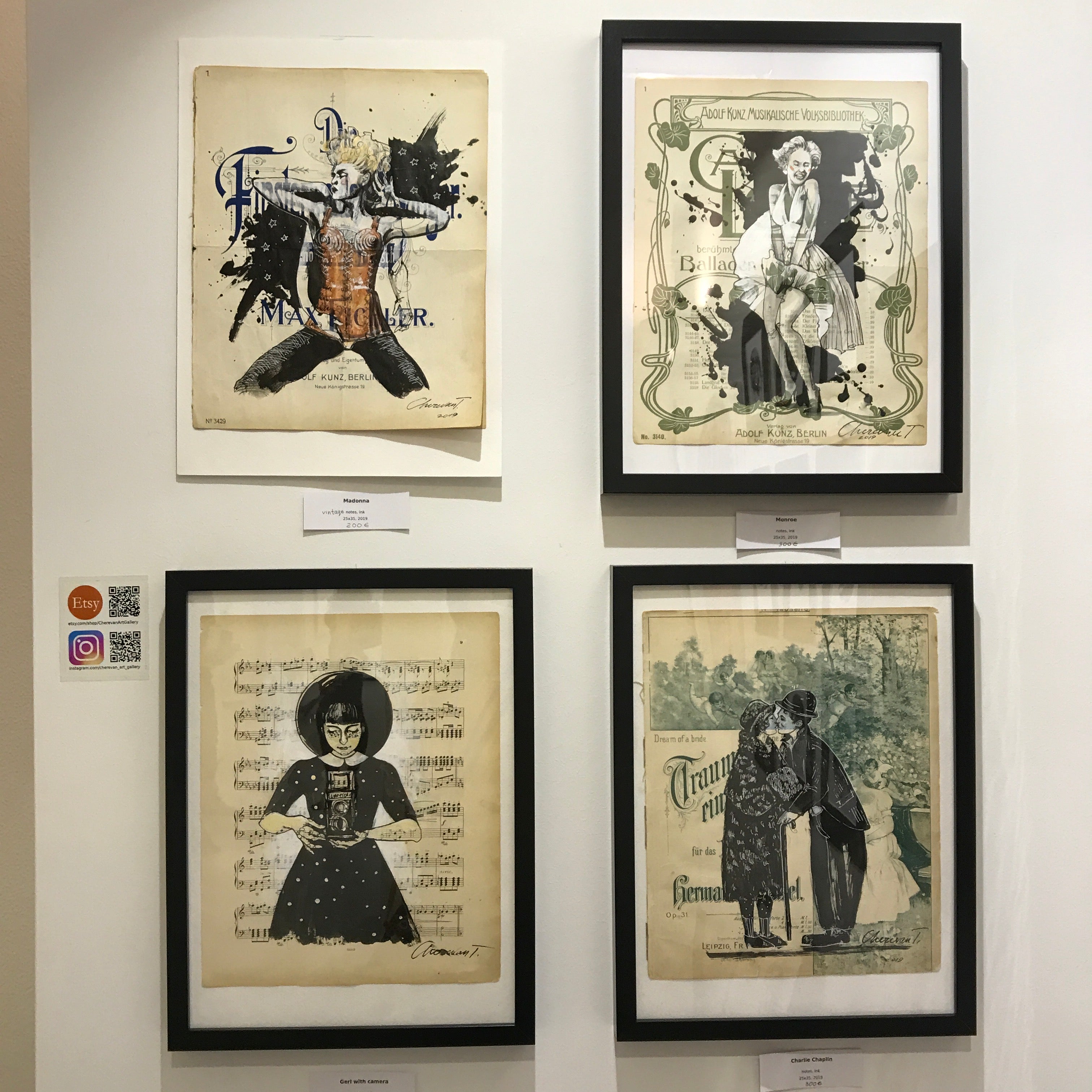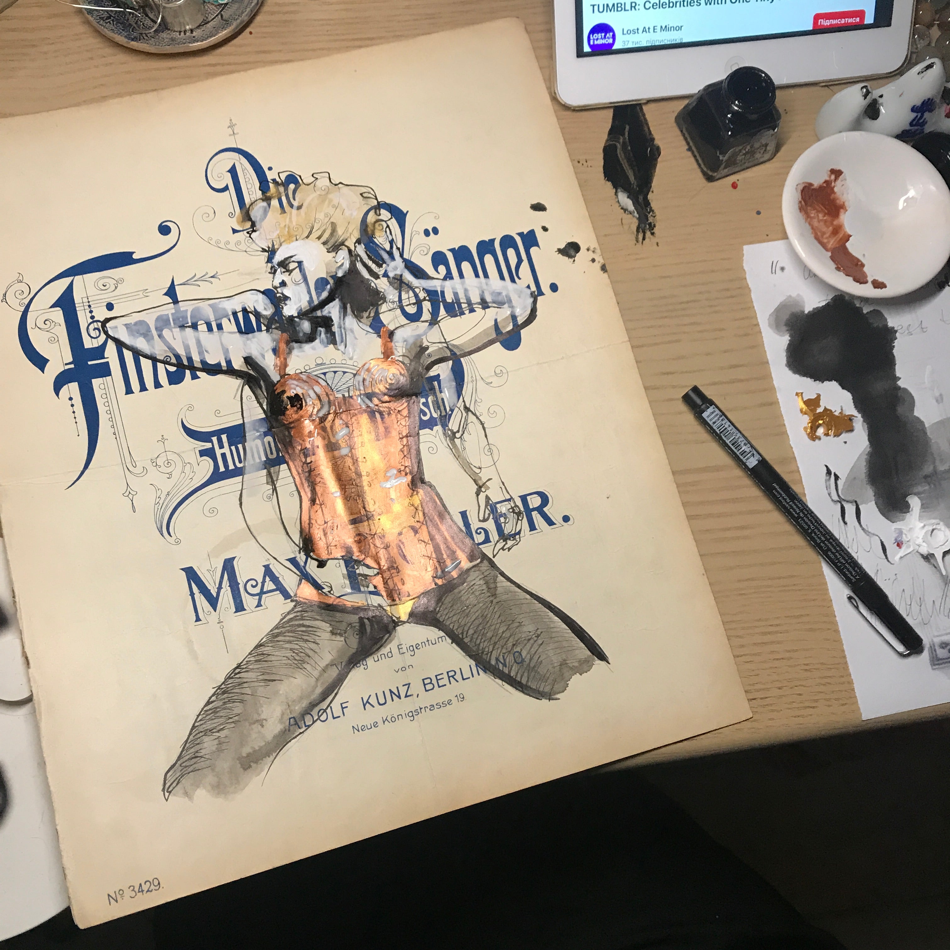 I drew in ink on vintage notes, listening to the 1890 recording of "The Washington Post March."