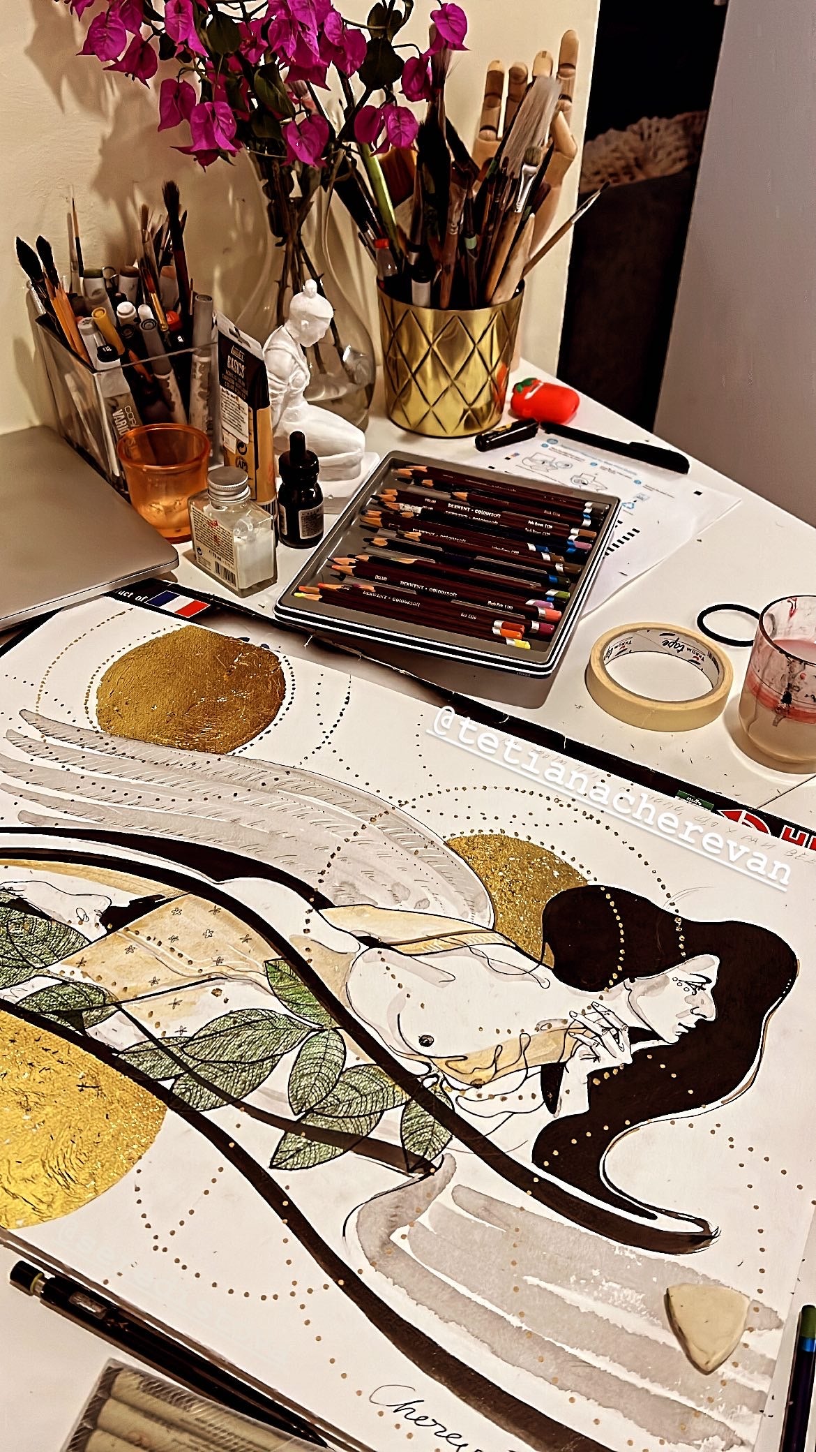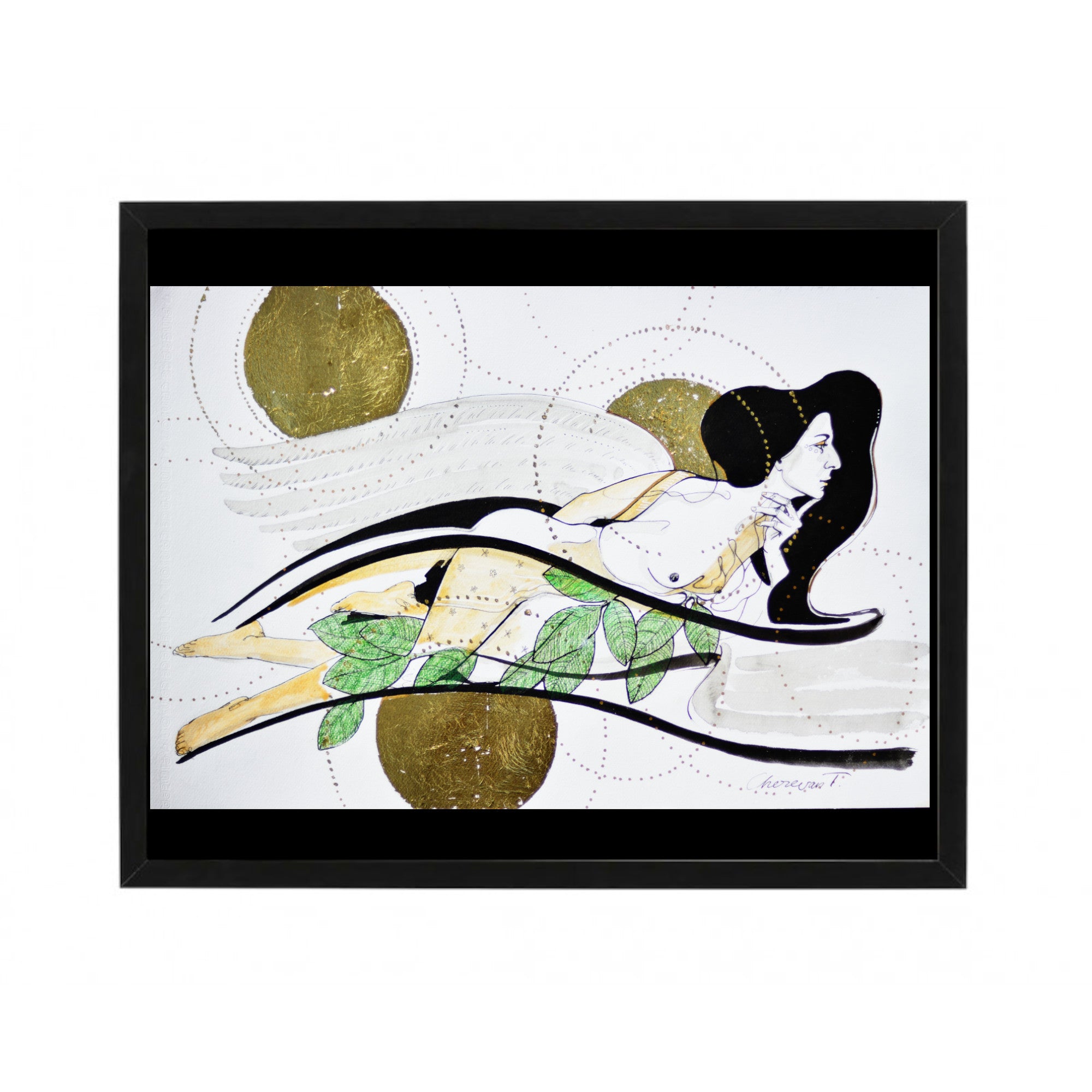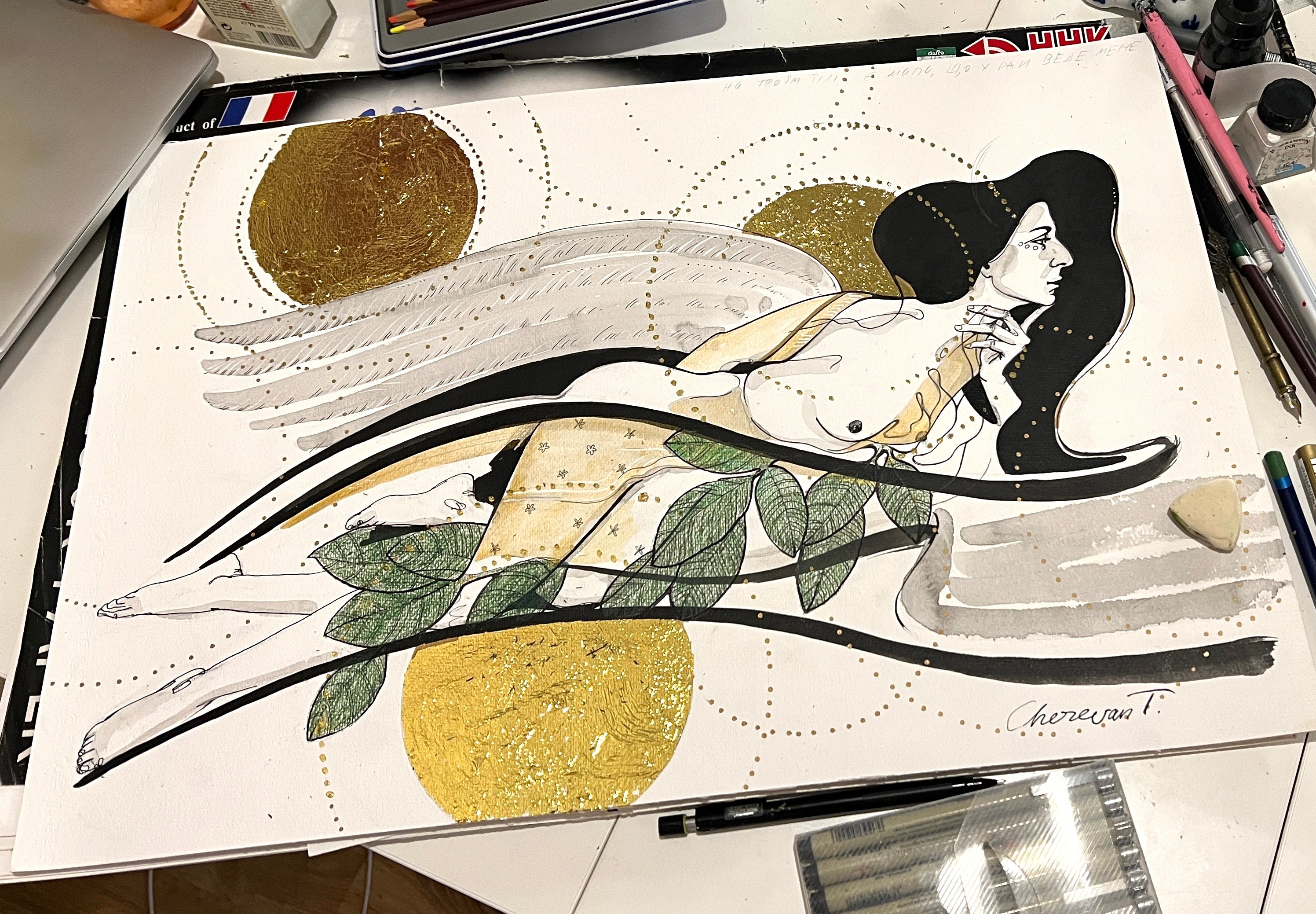 On Your Body, There Is a Map That Leads Me to Heaven" is an evocative artwork that intertwines themes of exploration, love, and myth. The piece uses black ink and gold leaf on exceptional watercolor paper to depict a journey across the contours of one's being, echoing the celestial allure of discovery. Inspired by the ancient symbol of the Triskele and the legend of Sicily's creation, it tells the story of three nymphs whose presence imbued the world with nature's richness, culminating in the birth of Sicily.