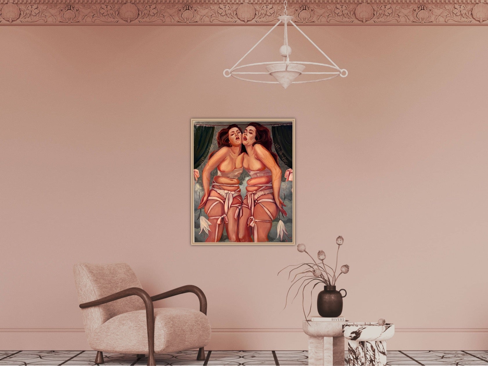 This painting features a man and a woman standing nude, proud and open, accepting their bodies as they are. A ribbon gently wraps around them with a message: "The body does not need permission to be beautiful."