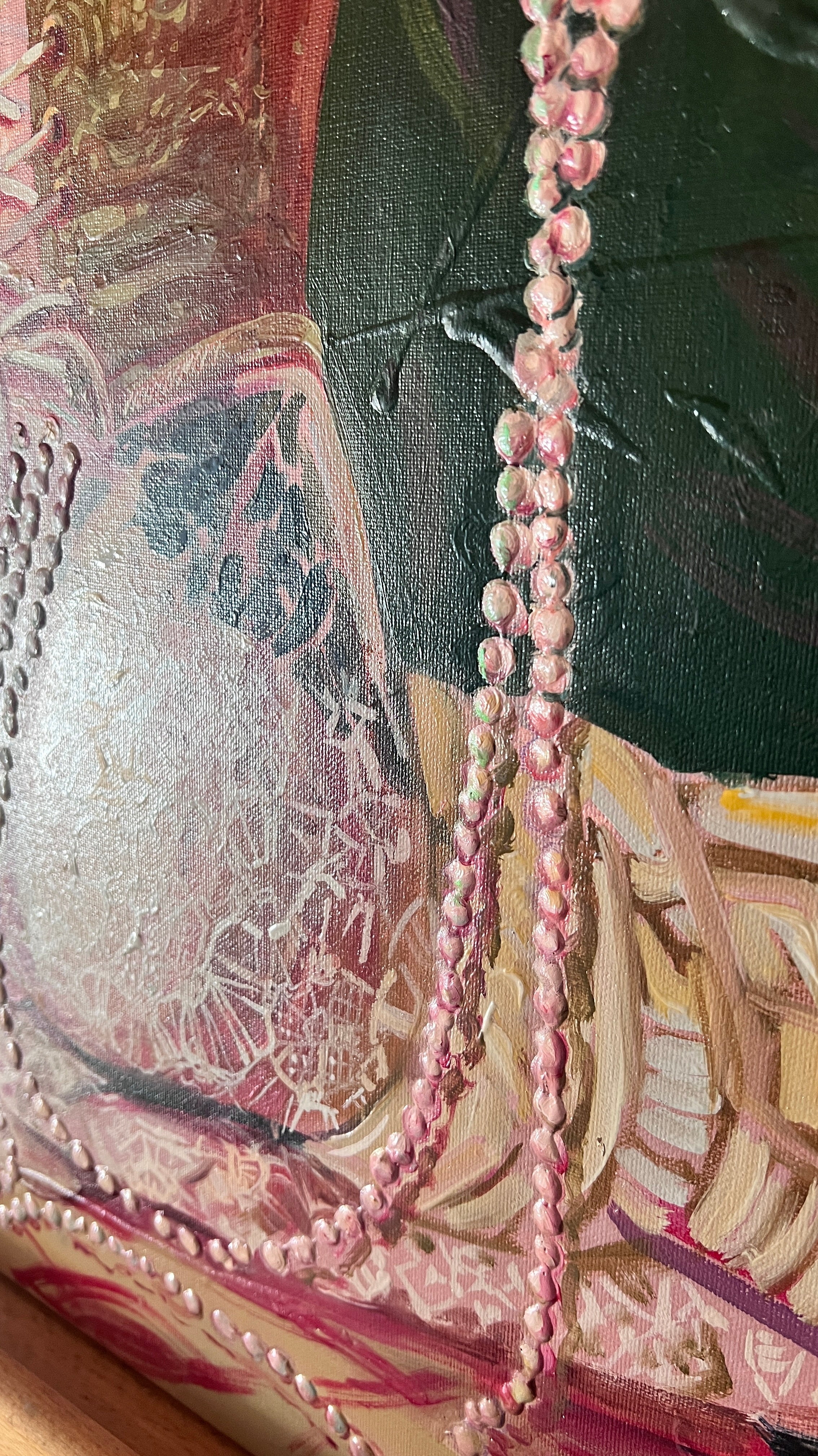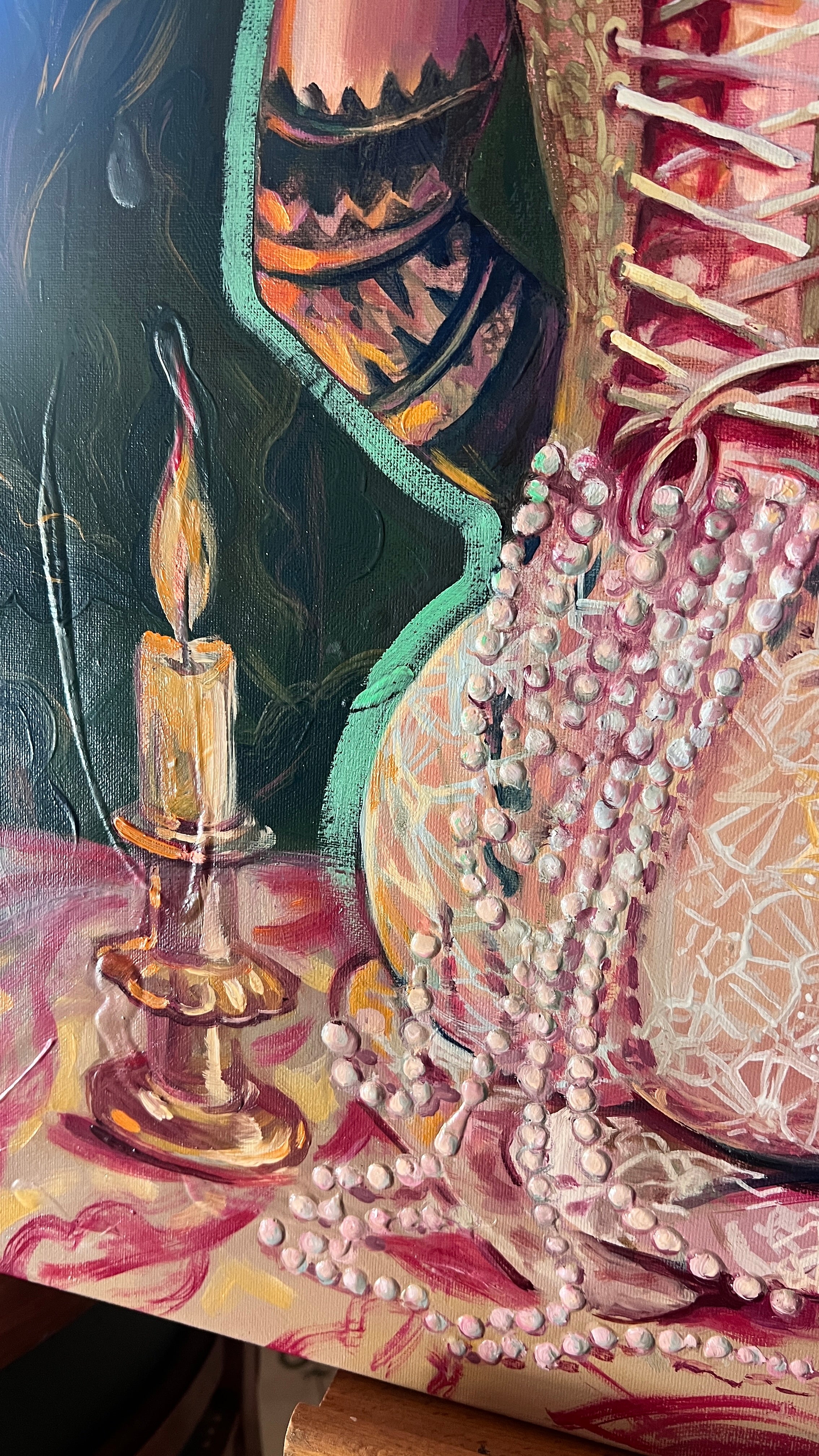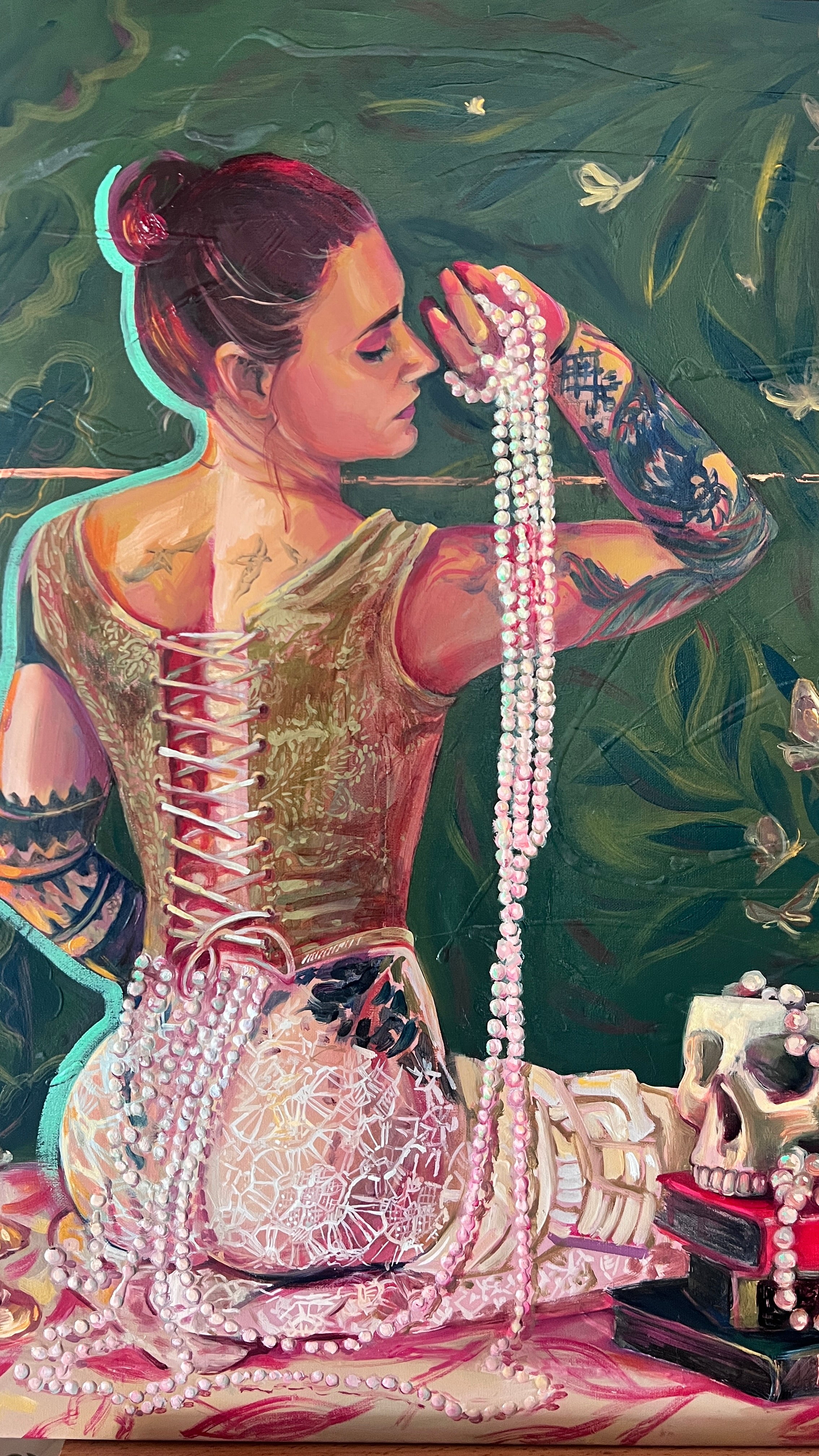 The corseted figure recalls a vase — but instead of flowers, she holds herself.