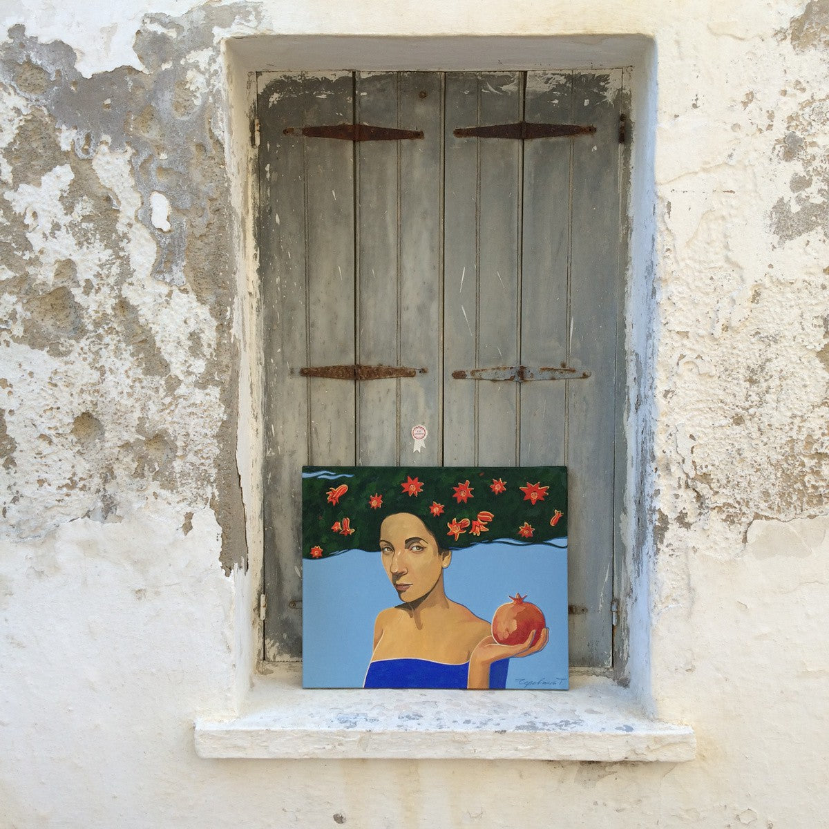 In 2016, while traveling with my family on the island of Crete, I discovered a magical glass workshop and restaurant. Everything there — from the lamps to the dishes — was made of colorful blown glass, as if in a fairytale. One evening, I met a young woman named Pelli, the daughter of the master glassblower. She served us with such warmth that I decided to paint her portrait. Later, we became friends, and years after, I returned to Crete to gift her a calendar with her portrait inside — a gesture that touched her deeply.