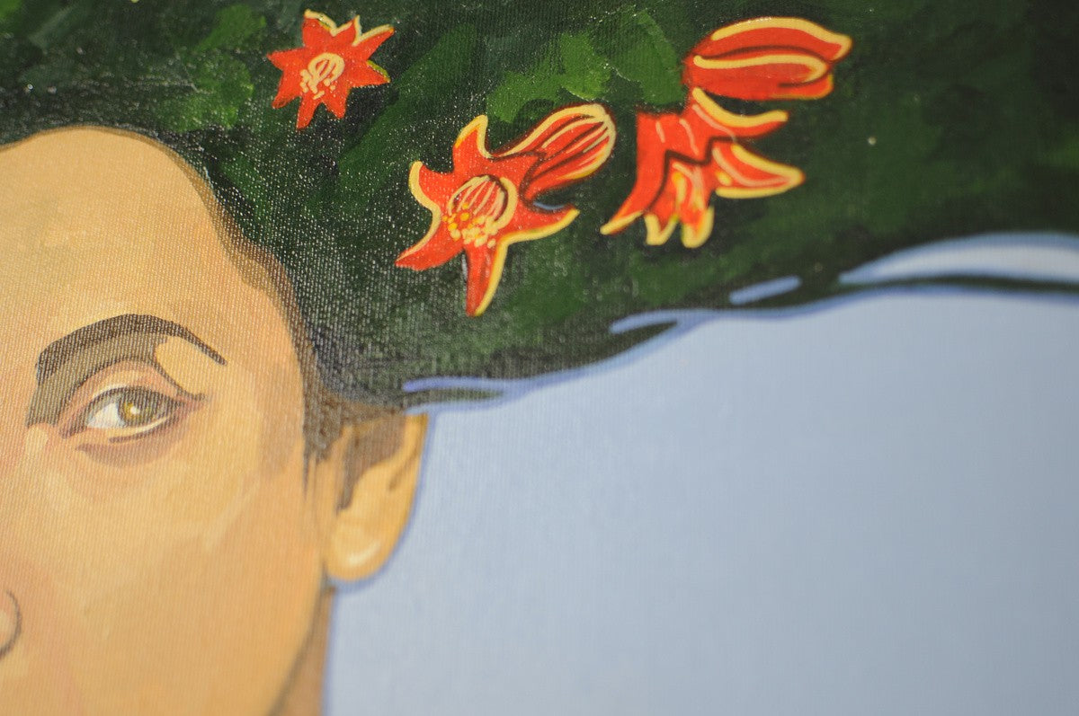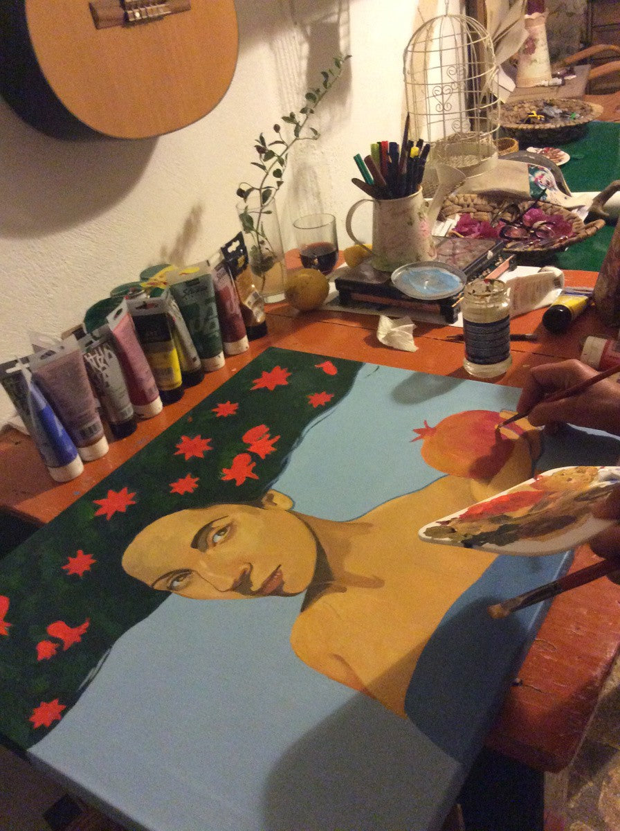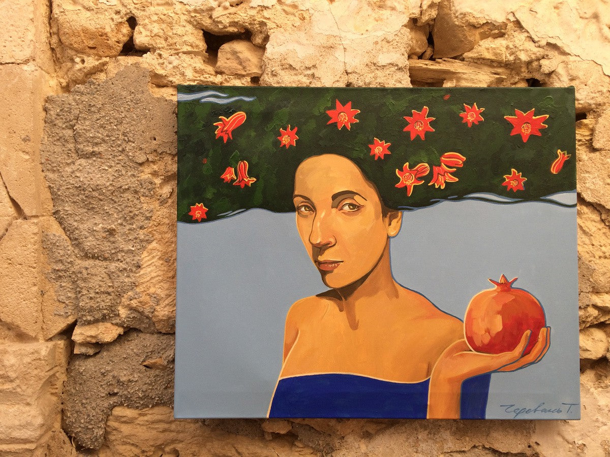 The painting also carries the timeless symbolism of the pomegranate. From the myths of ancient Greece, it is known that the pomegranate fruit grants immortality. One legend says that the goddess of love, Aphrodite, planted the first pomegranate tree in Cyprus. This is why, at Greek weddings, the breaking of a pomegranate symbolizes fertility.