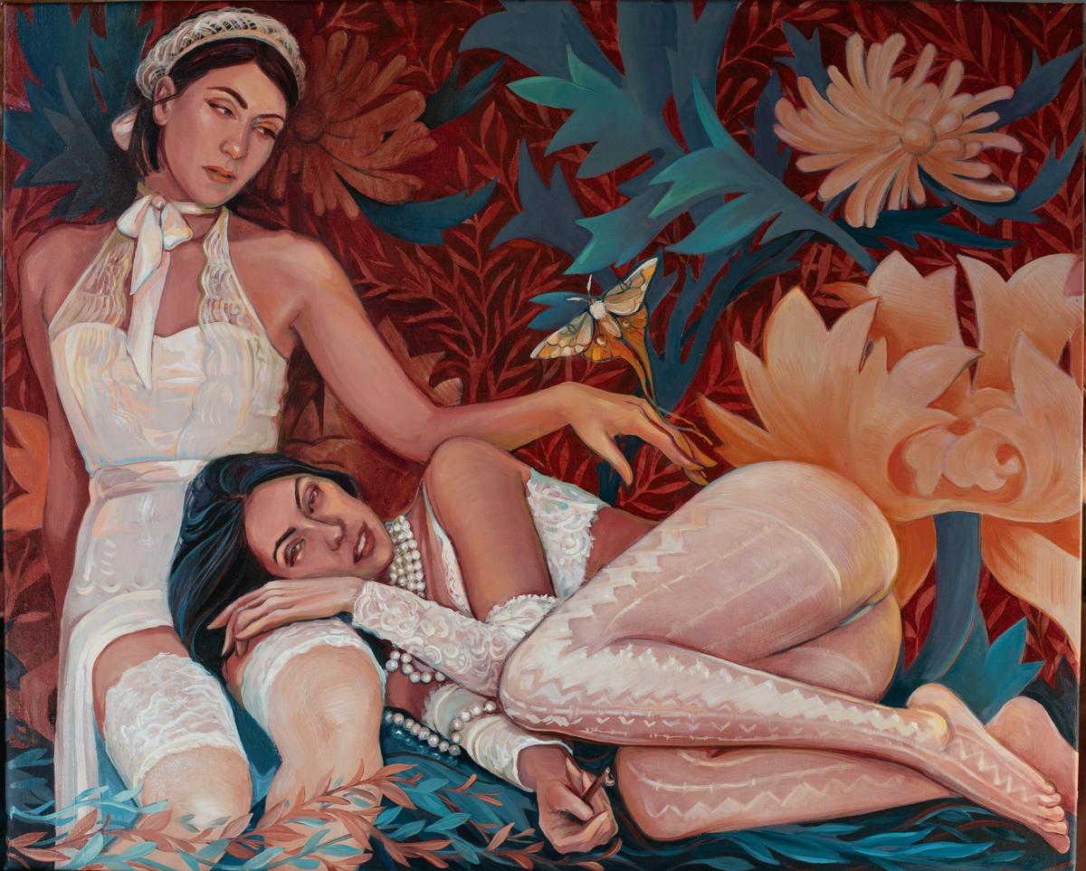 The garden in this painting reflects the inner worlds of the heroines. Their emotions intertwine with the flowers and the fragility of a moment where time seems to stand still. The butterfly flutters, leaving behind a sense that the search for the key continues, but the process itself is already part of the beauty of being.