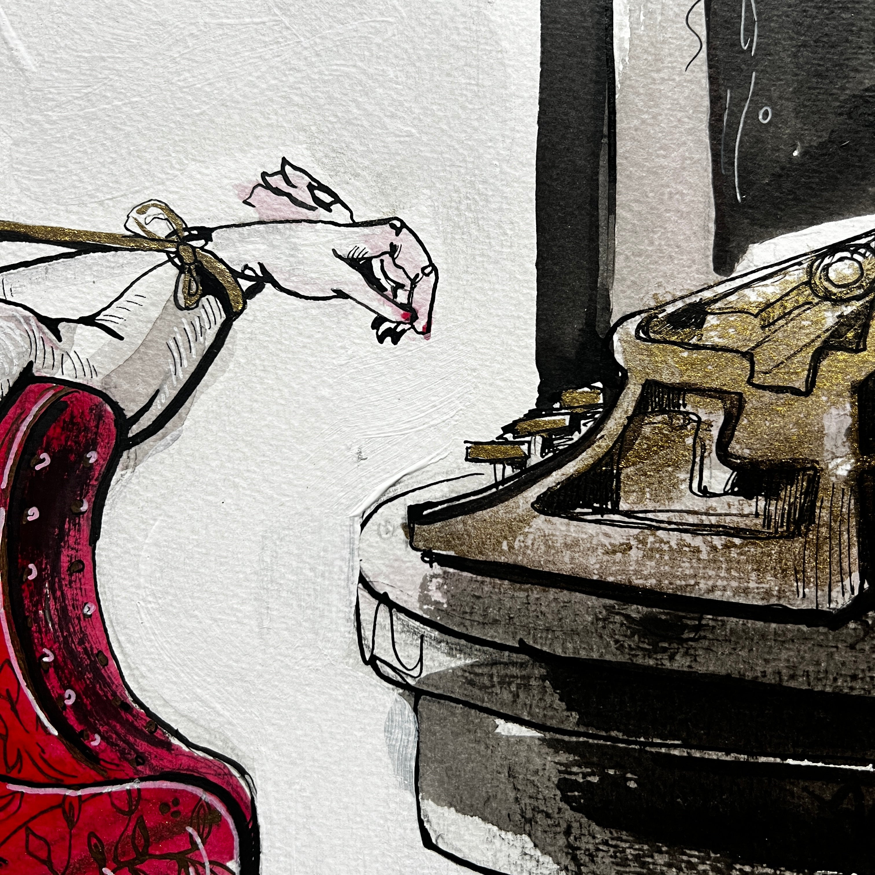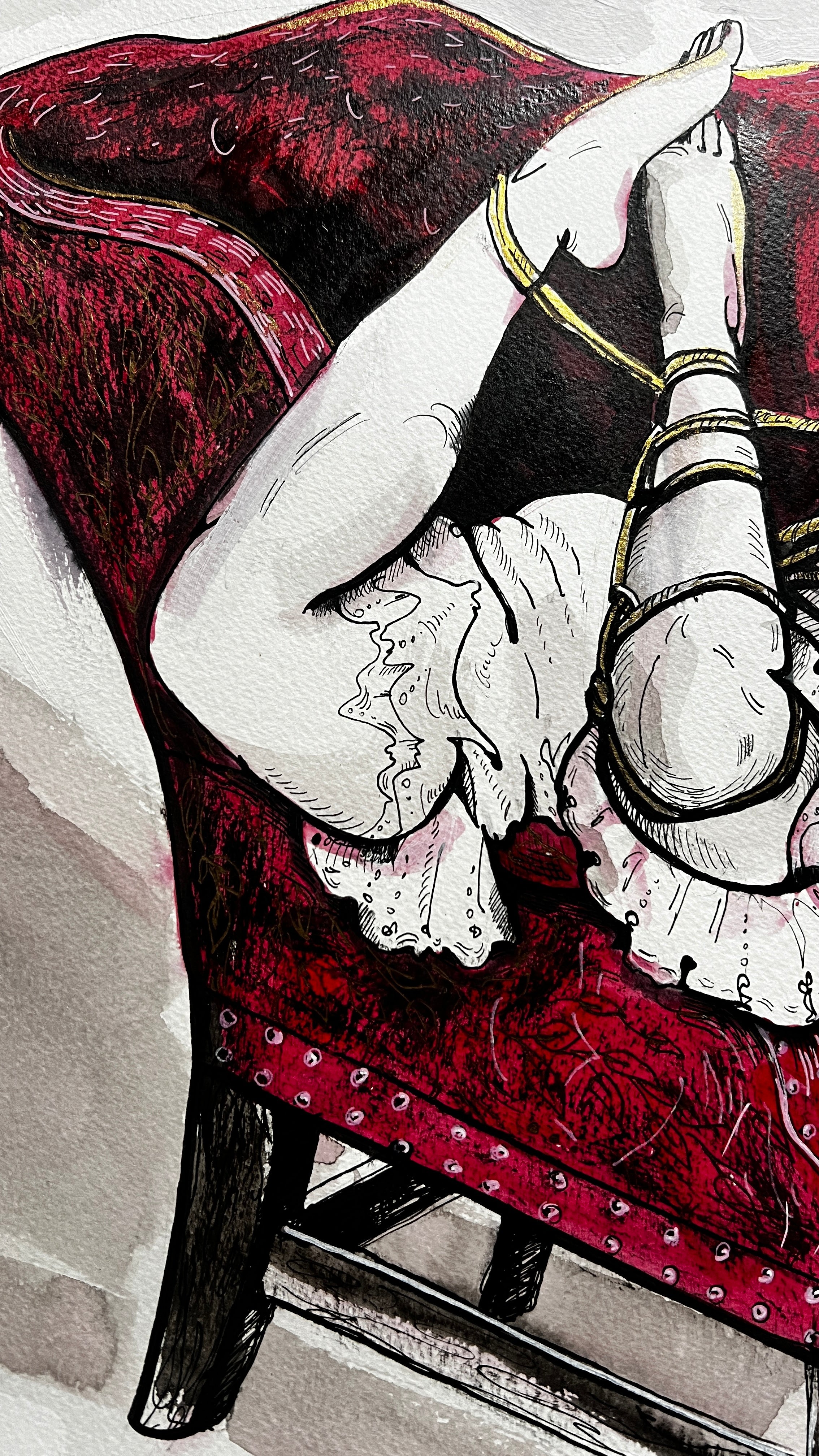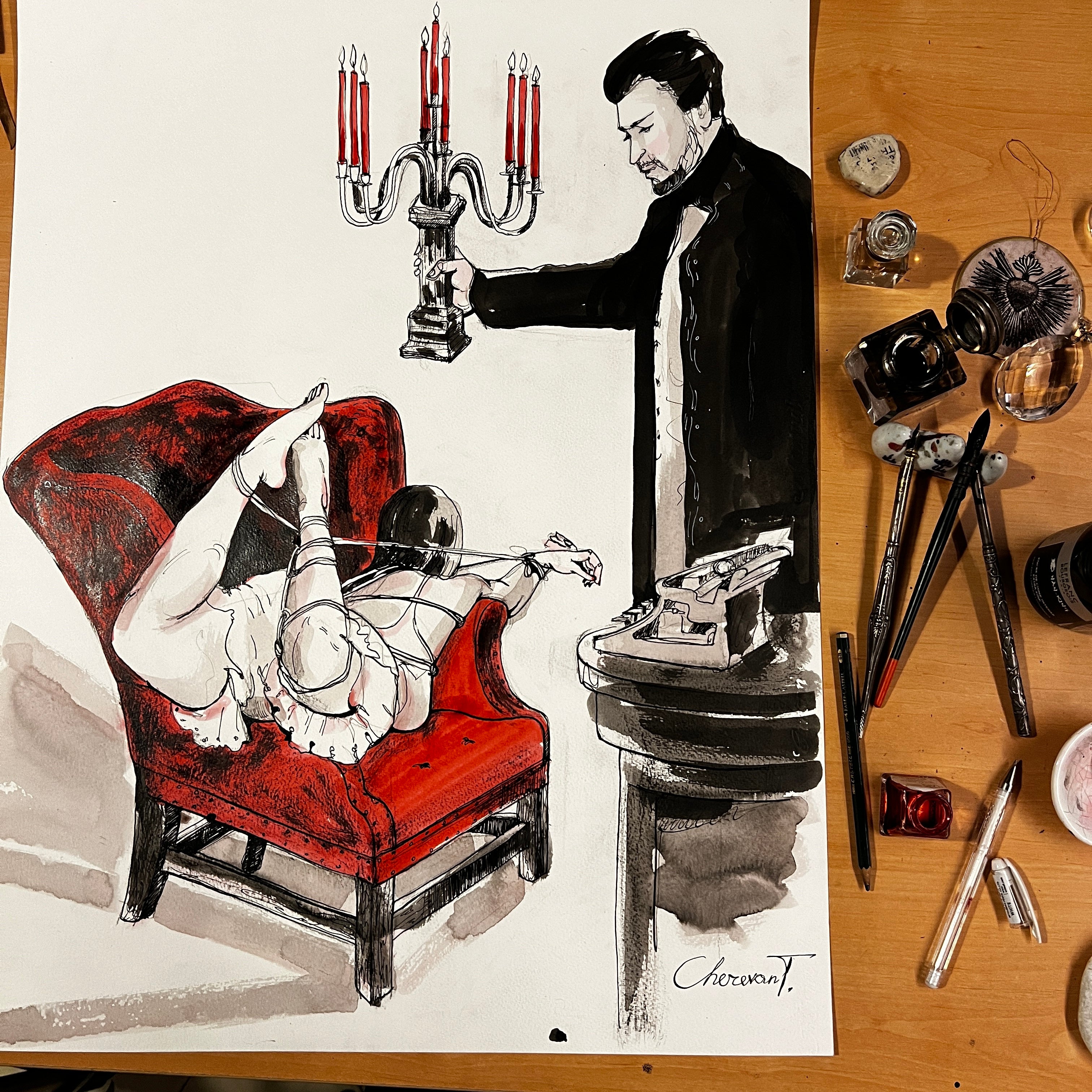 In the quiet of his study, by the dim candlelight, Edgar sat at his desk, writing an erotic story filled with mystery and desire. He was a poet whose words could evoke vivid emotions and fantasies. But tonight, he struggled to bring his visions to life. Exhausted, he leaned back in his chair, his gaze settling on the crimson armchair by the fireplace. The air in the room thickened with an energy that made his skin prickle. He watched as a woman materialized in the chair, bound in delicate ropes, her body an erotic display of submission and grace. He could hardly believe his eyes as she moved, the ropes creaking softly. In a trance, Edgar approached her, feeling a mix of arousal and dread. He touched the ropes, felt the warmth of her skin. It was as if the story he had written had come to life. But a sudden chill swept through the room. Edgar felt a malevolent presence seeping from the walls. He realized he had opened a door to something far more sinister. The woman in the chair was a siren, born of his desires but tainted by the darkness of his mind. With a cry, he pulled back, plunging the room into darkness. The woman remained in the chair, watching him. She was a part of him, a creation he couldn’t erase. In the end, Edgar was left alone in the darkness, haunted by his own creations, his mind forever entwined with the erotic and the macabre.
